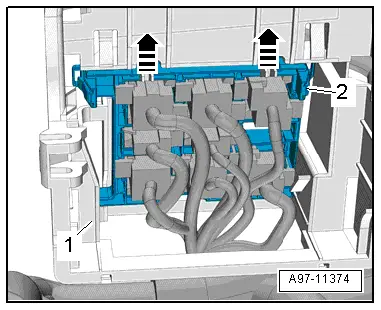 - Release the retainers -arrows- and remove the relay carrier -2- from the relay/fuse panel -1- to the rear.